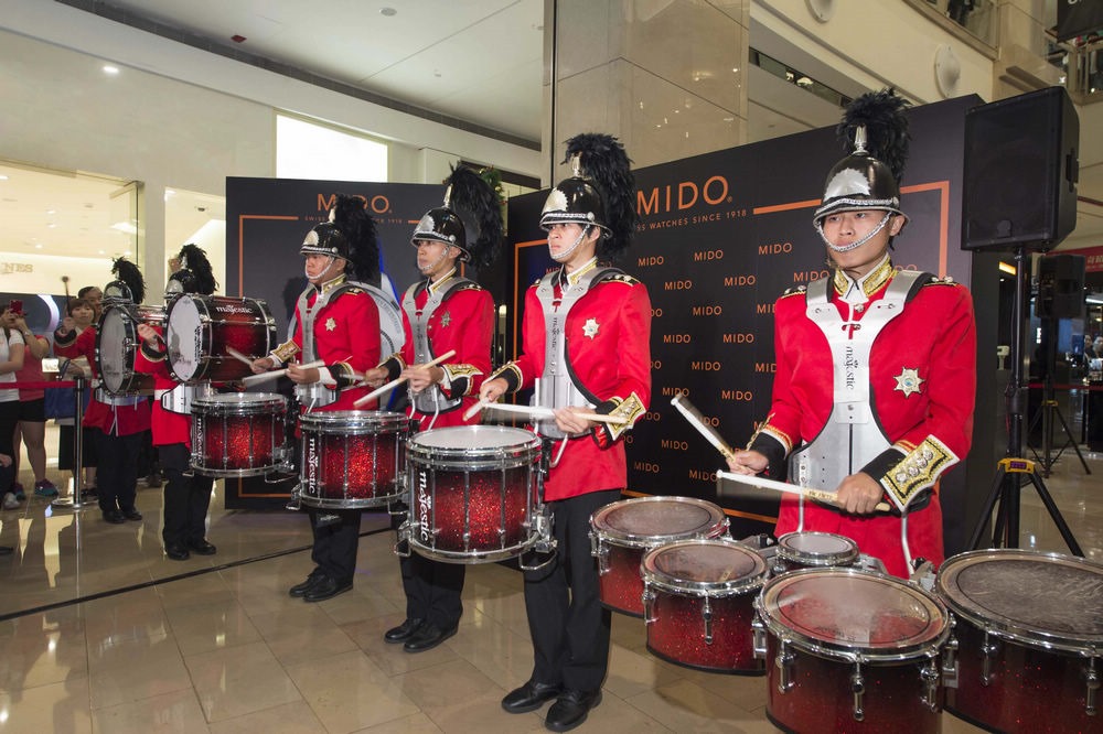 為了進一步詮釋Belluna II 雋永系列Heures & Minutes Décentrée腕錶的細節特色,開幕啟動儀式特別設計為大型錶款裝置,開幕前,MIDO美度表全球總裁Franz Linder與台北101總經理周德宇分別為腕錶放上時、分指針,最後由鳳小岳將秒針置於50秒的的位置,隨著機械錶特有的滴噠聲傳來,秒針精準運行至60秒位置,宣告MIDO美度表台北101名品店正式開幕。可別以為活動就此告一段落,此時遠方傳來充滿力道的鼓聲,一群身著英國皇家衛兵的鼓手們,踏著整齊的步伐緩緩走向舞台,不僅讓人置身英國倫敦的錯覺,同時也為Belluna II雋永系列的誕生寫下最完美的連結。