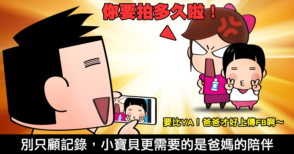 這個時候就會開始反省自己是不是也是這樣?喜歡拍小朋友可愛的瞬間,就急著趕快分享到社群網站一下;小朋友在做某件事情,也會趕快拿出手機記錄一下。自己有看過更誇張的是小朋友跌倒哭哭了,還是先放她在地上,然後再把這個過程錄下來(好歹也救她一下);或者是出門到某個地方,把小寶貝「固定」在某個地方之後,就開始拿手機出來滑,很像外勞在推老人家出去曬太陽,推到某個定點後,就繼續玩自己的手機…上面講的這幾點,你中了幾個呢?