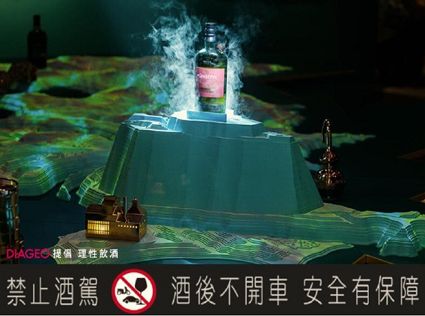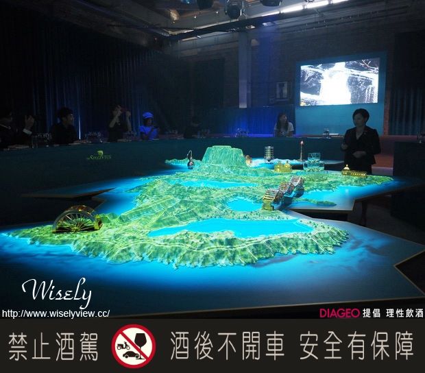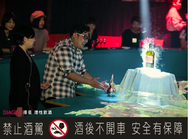 在劇場式品酩空間裡,讓人感到相當不同的品酩氛圍;而中央的品酩桌為蘇格蘭地形景觀,搭配立體投影讓品酩者更加了解蘇格蘭的風土環境,也透過品牌大使的解說,更進一步地了解它與威士忌製酒息息相關的緣由。