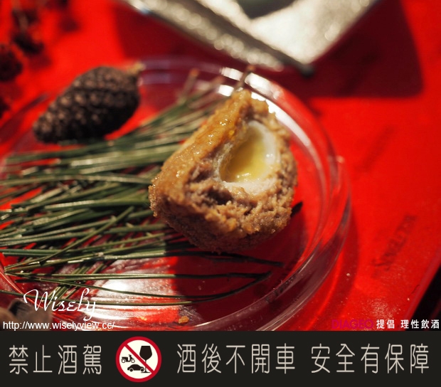 桌上擺放著三隻不同的蘇格登單一麥芽威士忌,讓我們可以與之後的蘇格蘭風味特色小點(canape)做結合品酩,其中第一隻透明無色的是蘇格登單一麥芽威士忌新酒,它的酒精濃度相當地高,但卻也讓Wisely領略了單純的威士忌原始的滋味。