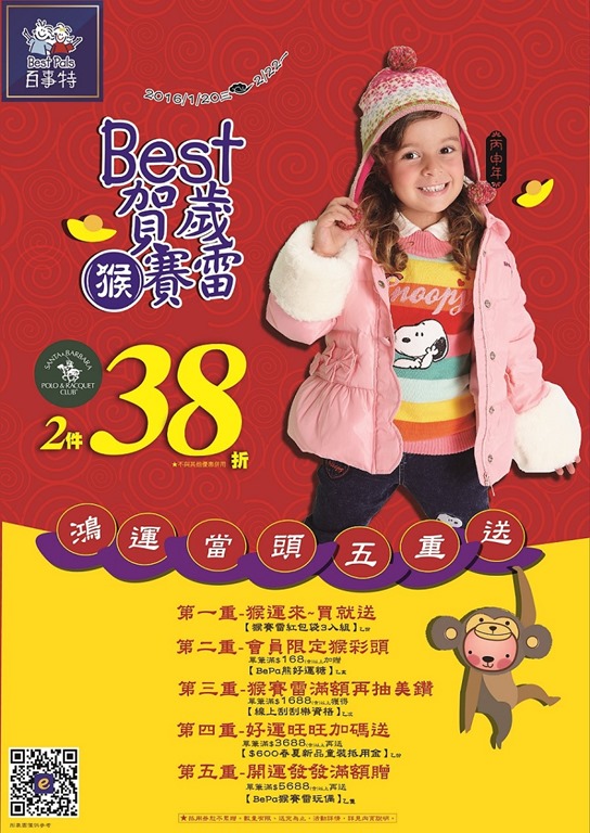 農曆春節是小朋友的歡樂季節,配合新年到來,各大童裝品牌陸續推出充滿年節喜慶氣氛的商品,並且推出各種春節優惠專案。知名連鎖品牌「百事特童裝名店」自1/20(三)起春節期間,搶先推出【Best賀歲猴賽雷】折扣活動,提供秋冬童裝福標價5折起優惠;【鴻運當頭五重送】超值活動,則有機會贏得價值不斐的美鑽,總獎項超過15,000個。