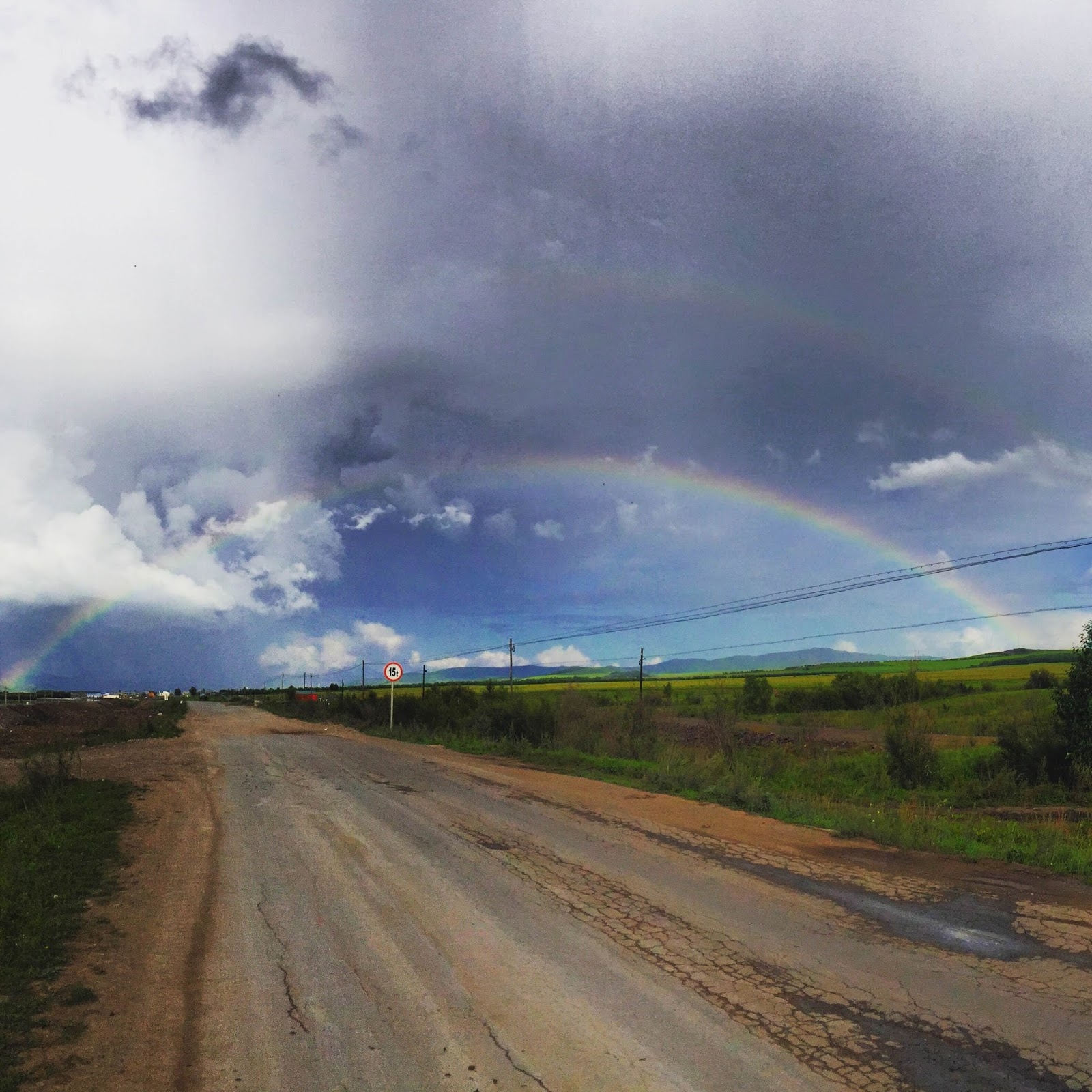 「欸!有-彩-虹!」 應該是包車旅行的第一天,午後陣雨讓我們錯過一個景點,但天上卻出現了彩虹。師傅聽我們大聲嚷嚷,把車停在路邊,讓我們玩個夠。前一天,台北的天空出現了稀有大彩虹,心裡還有點遺憾沒親眼看著;不過一天的時間,彩虹就以更清晰的半圓輪廓來草原找我們玩耍了。