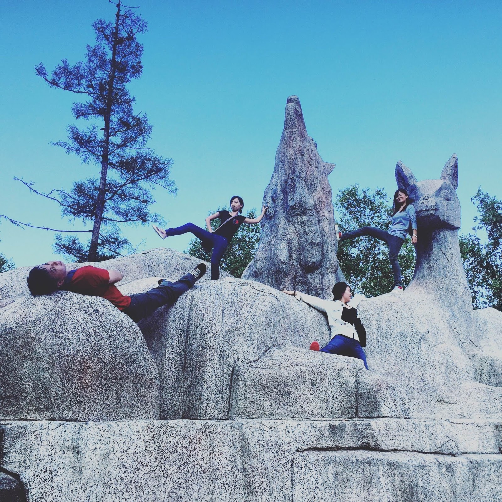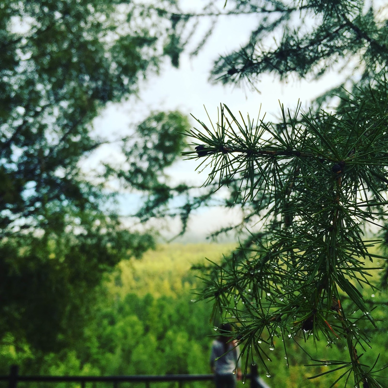 比如有一天下午,玩完上車就昏沉沉跟著車身的顛簸節奏睡著了,沿路隱約聽到車頂霹哩啪啦的敲打聲,我想,下雨了吧。又過了一會,車停了,師傅又趕人下車了。剛睡醒眼睛很乾,一睜眼隱形眼鏡就快要掉出來,我一邊眨著眼睛一邊搖搖晃晃走到路邊,眼下是一片松樹林,上頭覆蓋著一層薄薄的雲霧,除了我們路邊沒有別的車了,空氣裡很安靜,瀰漫著還未散去的瞌睡蟲,還有雨水濕潤的氣息。