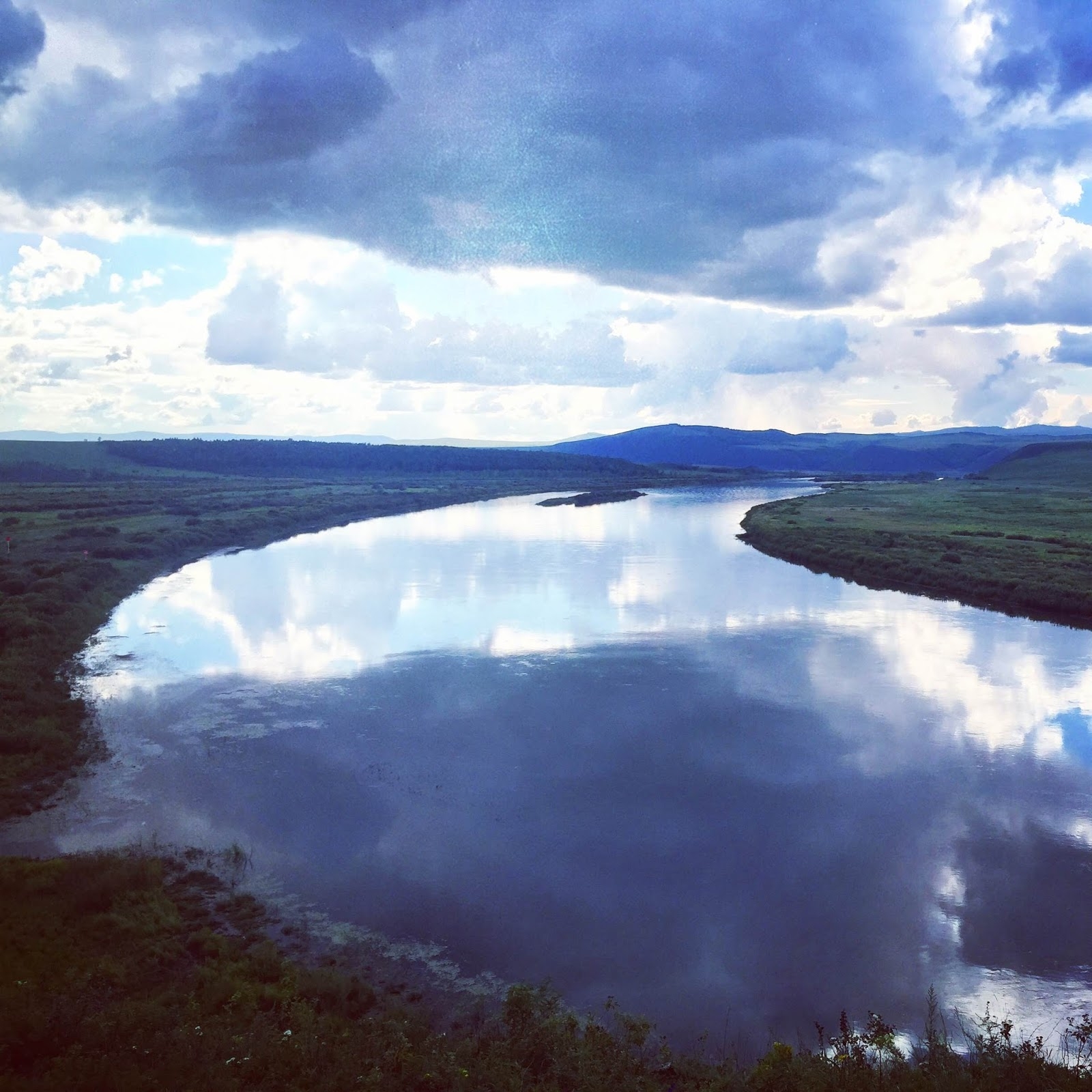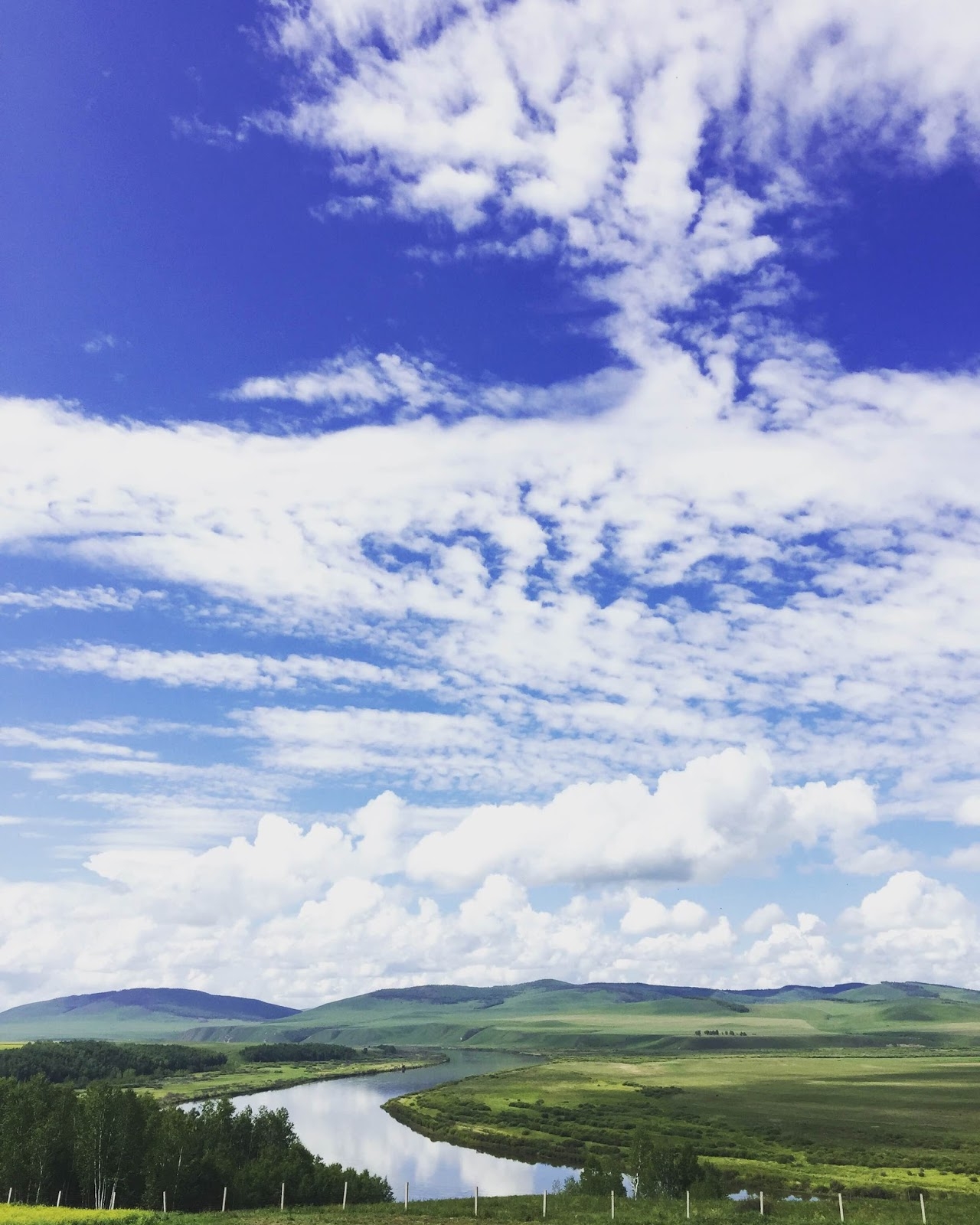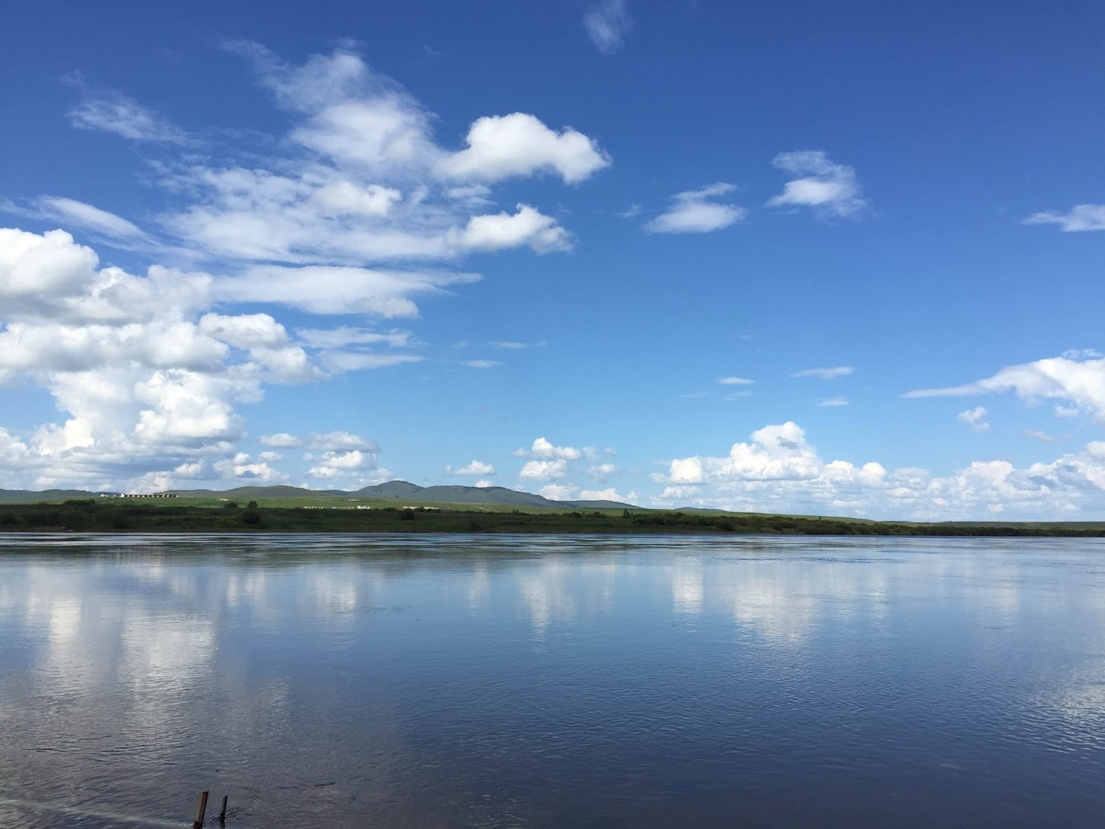 小山丘的頂上反而讓人驚嘆。額爾古納河蜿蜒的河道就在這座山前轉了一個大彎,形容陽光照在河面上很漂亮的那句成語應該叫作波光粼粼吧。坐在山頭,我幻想,如果不坐那艘該死的船,我可以在這裏好好地聽音樂,唱首歌,看雲朵在天空飄動。不過,人生沒甚麼如果不如果,沒坐過那艘船也不知道這個山丘多可愛吧。