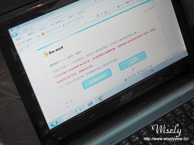 在啟用之前要有一個步驟,就是得將接好的網路進行開通的作業,等到確認成功之後就可以開始暢快使用So-net光纖上網囉!(在當場,Wisely還請工程大哥使用他的小筆電連上我的部落格做個測試…嗯~果然跑的挺順的!XD)