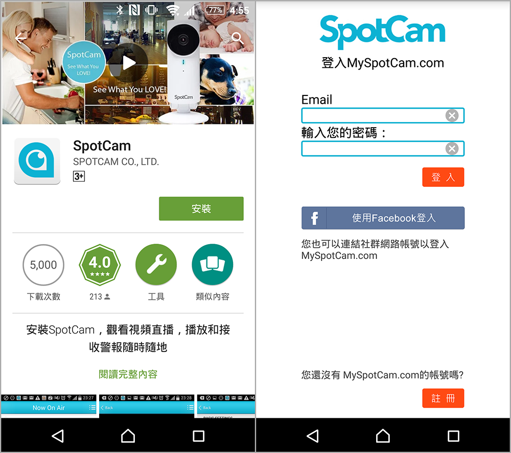 恰爾斯因為以前就註冊過了,只要新增 SpotCam 就可以了,還沒安裝過的朋友需要先註冊,在這裡也可以用 FB 帳號來註冊登入,貼心!