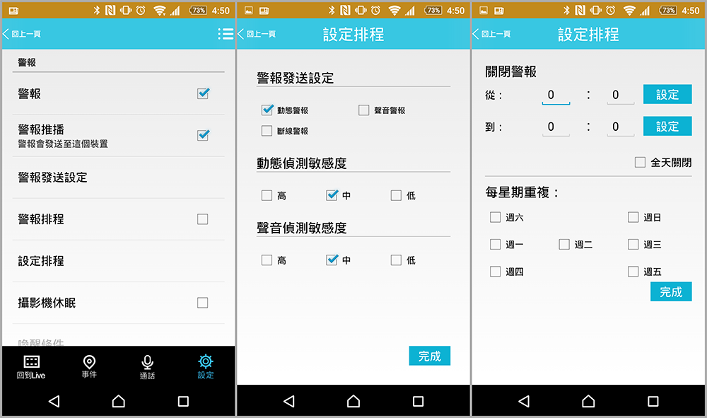 平常可以根據需求做一些「警報推播」的設定,看是要根據動態的敏感度、聲音或是斷線狀態來做警報發送,我們也能夠設定排程,當下班或不在的時候就設定警報,平常就維持休眠狀態就可以了,不會佔用家中的網路頻寬用,真的是聰明的監控好幫手。