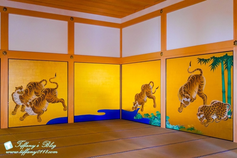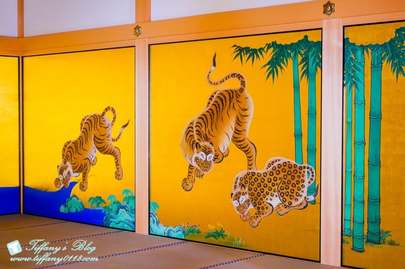 金碧輝煌的壁畫搭配著看起來像是報又像是老虎的動物