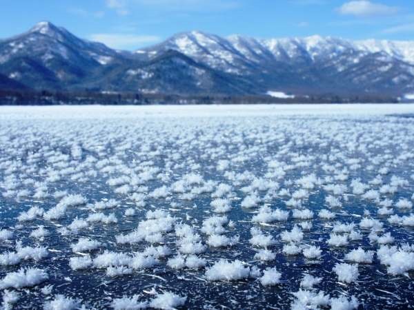 霜花,是水蒸氣經由冷卻,在寒冷湖面上所結成的冰晶,隨著更多蒸氣逐漸形成如手掌般大小的結晶體,又稱為「冬之花」,這些霜花精緻美麗卻脆弱,輕輕一吹就會融化。阿寒湖受到湖底湧出溫泉的影響,冬季湖面的冰層僅薄薄一層,使得霜花容易形成,也因此成為12月~3月間的著名景點。