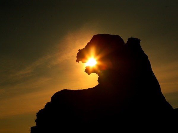 位於秋田縣男鹿半島的鹽瀬崎,其崎嶇的岩石相當受到釣魚愛好者的青睞,其中最吸引人注意的「哥斯拉岩」,其形在白天彷彿專注凝視著大海,而黃昏來臨時,染上黑影的岩石顯得神祕恐怖。當落日並排在岩石的巨大缺口旁,彷彿如哥斯拉口中在噴火一般,場面非常壯觀。