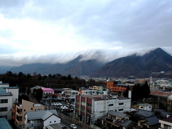 長野縣的北方,越過太郎山至虚空蔵山的山脊,滾滾而下的「逆霧」雲層,一面朝上田市方向如瀑布般降下,一面隨之消散。主要因上田市北邊大部分的山峰都擋住了迎來的雲氣,但霧卻沿著太郎山和虚空蔵山之間較低的區域越了過來,在季節轉換、溫度驟變時就有機會看到。