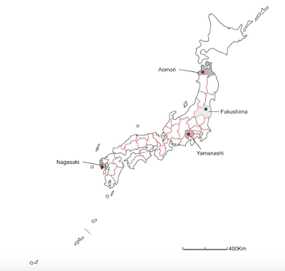(津田團隊研究福島地區(藍),林田團隊分析青森、山梨、長崎(紅))