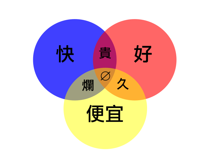 工作品質與效率之間的取捨,究竟何者為上?其實這個問題是非常難回答的,也許有些事情只要快就好,而有些事情的品質是一分也不能讓,這兩者之間的選擇恐怕沒有一個標準答案,而在很多的情況下,日本人做事是很沒有效率的,相對的,犧牲效率反而是為了追求更細緻的表現。我們始終必須理解的是,「快」、「好」、「便宜」這三者之間是沒有交集的,你所付出的量,將決定成果的質,除非你也能在湖上行走。