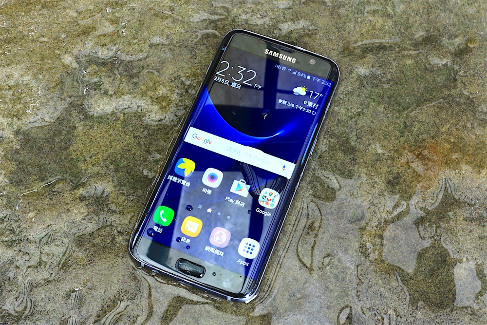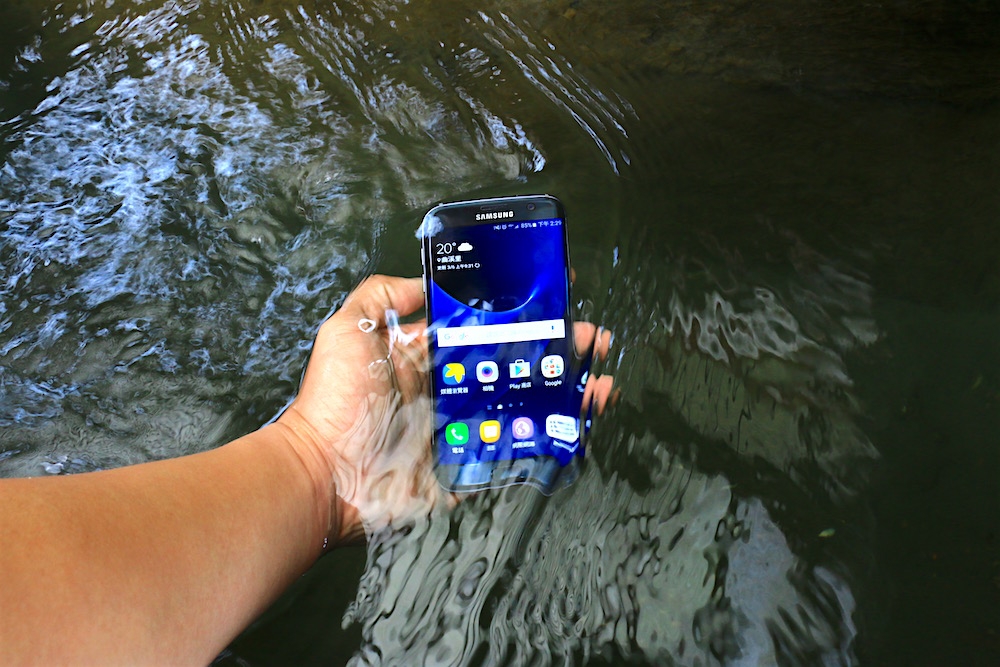 Galaxy S7 edge 採用了 IP68 防水技術,測試當天剛好發生不小心被飲料潑到的狀況,為了將螢幕濕濕黏黏的 S7 edge 清洗乾淨,就直接將 S7 edge 放入冰涼的河水中稍微清洗一下,不僅將表面清潔的乾淨溜溜,還因冰涼的河水直接沖洗玻璃,使得正反兩面玻璃變得相當冰涼舒適。不過,這邊必須提醒一下,防水僅限清水,若是將手機使用清潔用品清洗、放入溫泉、海水、熱水等環境,可能會造成防水失效,使用時必須特別注意。