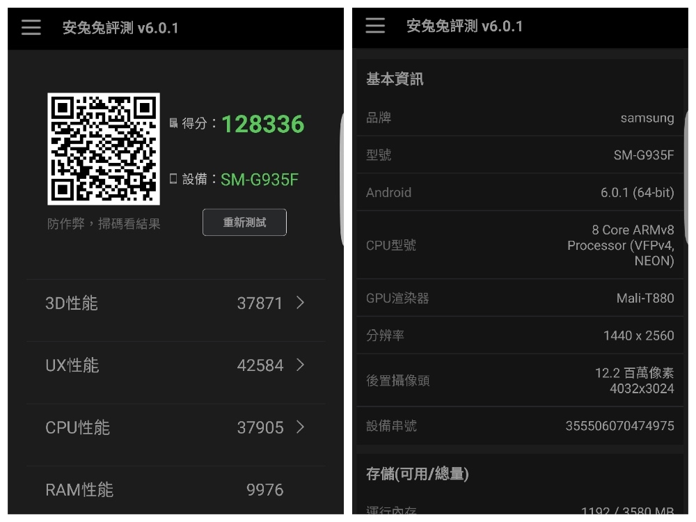 前面提到,Galaxy S7 edge 採用自家研發的 Samsung Exynos 8890 2.6GHz+1.6GHz 八核心處理器,並搭配 4GB RAM/32、64GB UFS 的記憶體組合,而這樣的硬體配置也直接反應在跑分的成績上,我們以安兔兔評測 APP 實測,S7 edge 測出了 12 萬分以上的驚人成績,更也證明 S7 edge 的Samsung Exynos 8890 處理器效能屬於前段班的優秀成績。