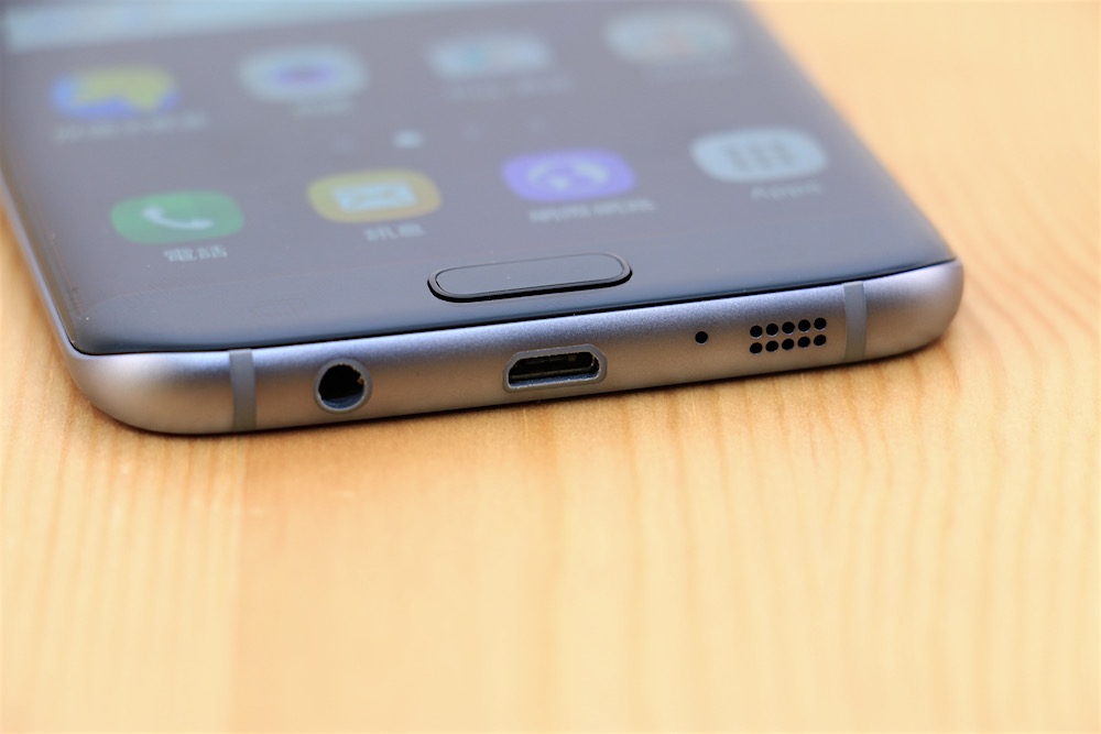 Galaxy S7 edge 底部的配置也與前一代 Galaxy S6 edge 相同,由左至右分別為 3.5mm 耳機孔、micro USB 充電孔、麥克風及喇叭。