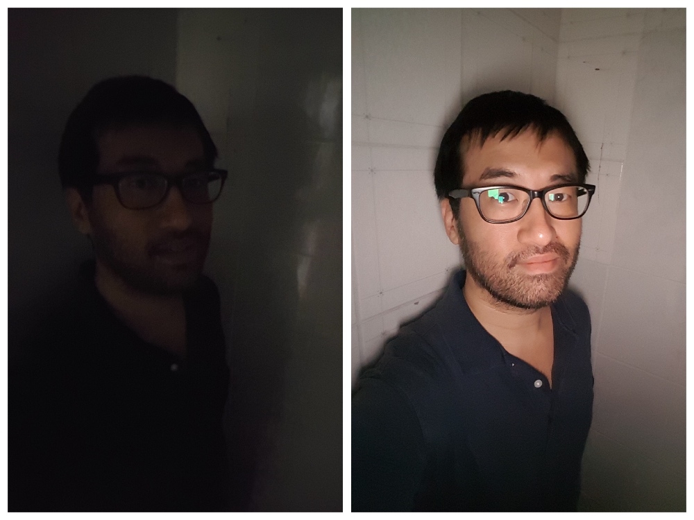 Galaxy S7 edge 除了優秀的 1200 萬畫素主鏡頭之外,自拍鏡頭的表現也不容小覷,採用了 500 萬畫素自拍鏡頭,並配有 F1.7 超大光圈、螢幕自拍閃光燈及美顏自拍應用,讓喜歡自拍的朋友在 KTV、戶外咖啡廳等微光環境中也能拍出美美的照片。而下面這組照片對照,是在光源極低的環境中使用 S7 edge 的自拍鏡頭所拍攝,左圖是完全沒有開啟螢幕自拍閃光燈的狀態,可以看到僅能呈現些許的頭部輪廓,眼睛、鼻子等細節幾乎是黑的,而右邊的照片則是開啟螢幕自拍閃光燈的效果,除了讓自拍照有明顯的亮度提升之外,透過柔和的米白色補光效果也讓皮膚的色澤更加自然。