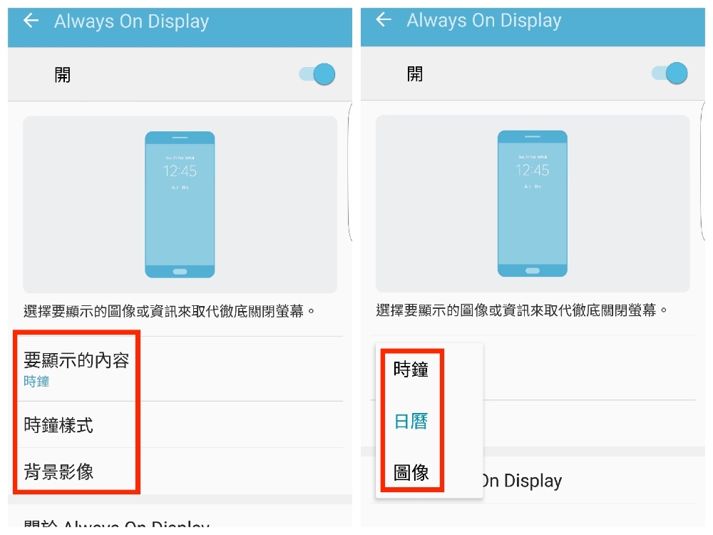 點入 Always On Display 後,除了可以自行決定開或關之外,下方也可以選擇想要呈現的資訊,比方說時間、日曆或是圖像。