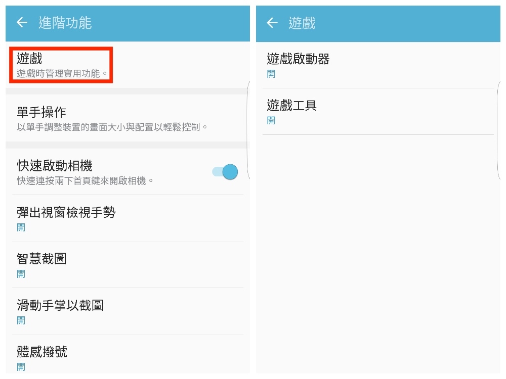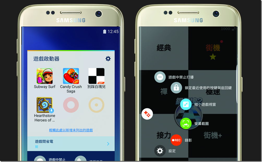 許多人喜歡在玩遊戲時進行遊戲錄影,除了可以將自己高超的遊戲技巧錄製成影片分享至網路上之外,過程中若是打到稀有虛寶也是一種見證奇蹟的時刻,為了應因這股熱潮,Galaxy S7 edge 特別加入了遊戲啟動器功能,遊戲啟動器內建了遊戲啟動器及遊戲工具兩個功能,前者能將手機中的所有遊戲整合在同一個分類中,並可提供遊戲間省電的功能,透過降低畫面更新率及降低解析度的方式來達到省電效果,後者則是可以在遊戲過程中以一個小 icon 方式放置在一旁,點選後可以開啟禁止打擾、返回與多工鍵鎖定、截圖、遊戲錄影等功能。