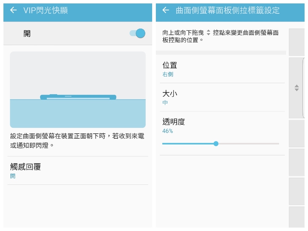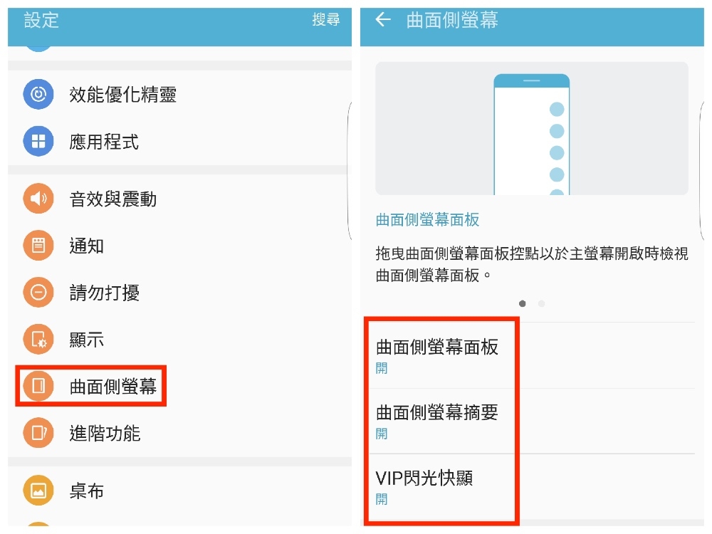 完成設定後,就能直接透過由螢幕邊框向中間滑動的方式叫出曲面螢幕功能,查閱自行設定的功能。