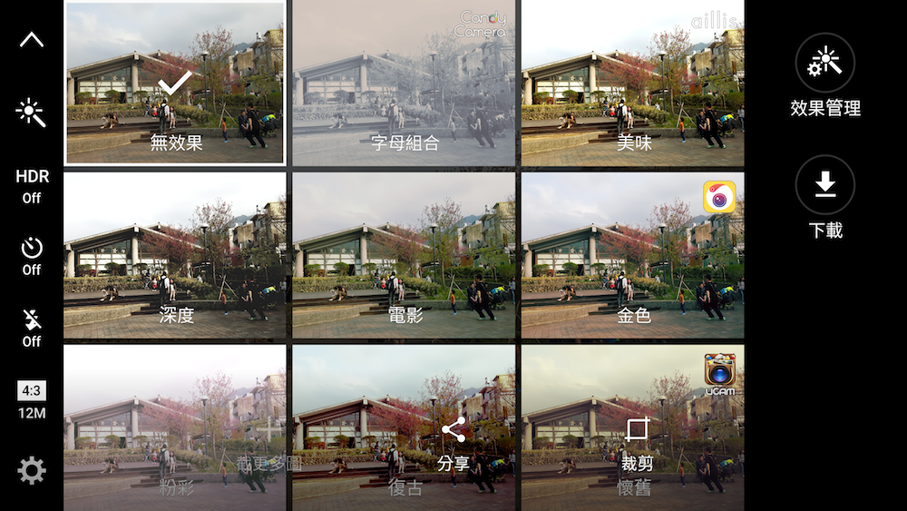 Galaxy S7 edge 內建許多有趣的濾鏡功能,開啟濾鏡後會出現九宮格濾鏡效果即時預覽,讓使用者可以直接透過預覽的方式檢閱濾鏡是否符合當下環境,再點選即可套用。除了內建的濾鏡之外,一旁還有提供其他濾鏡下載的功能,覺得內建濾鏡不夠用的朋友可以下載看看。