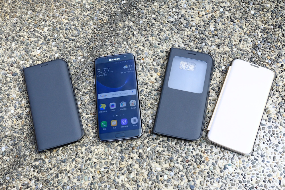Galaxy S7 edge 週邊配件相當豐富,由左至右分別是翻頁式皮套、透視感應皮套與全透視感應皮套,每款皮套都相當適合 S7 edge,拿到新手機時不妨到三星門市替 S7 edge 買件舒適的外衣吧。