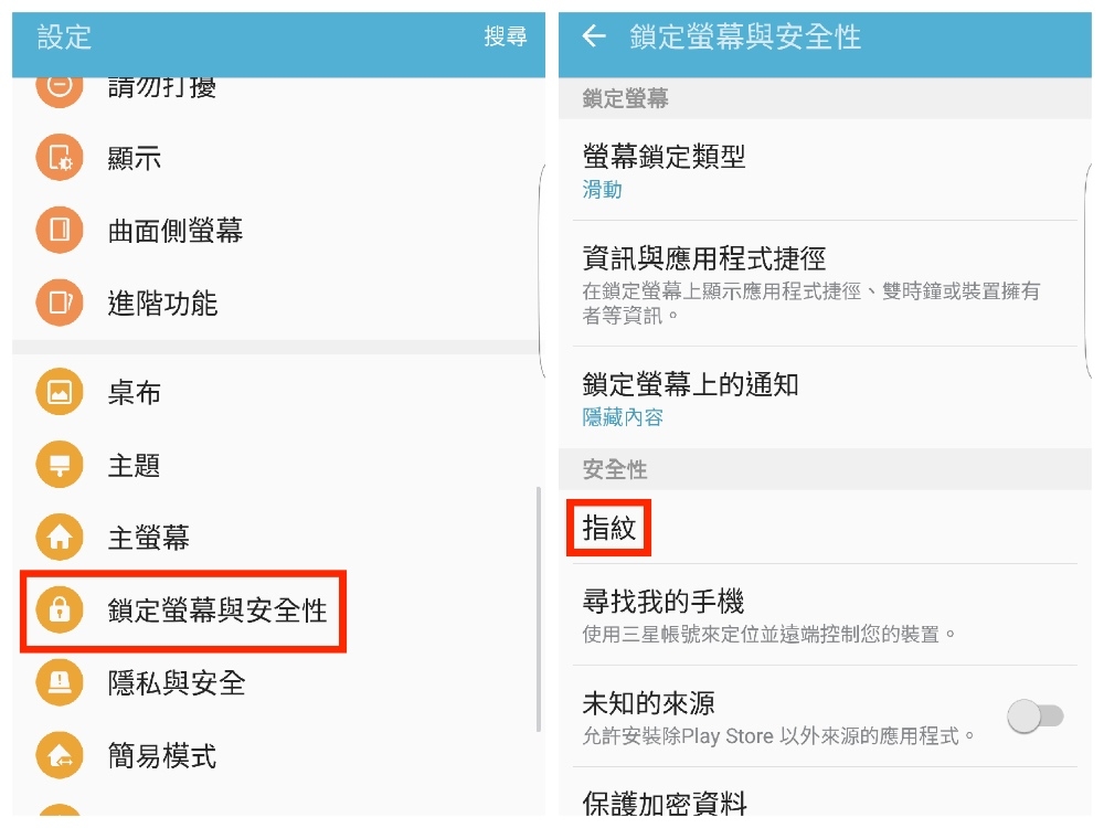 指紋辨識設定方式也相當簡單,首先,進入設定中找尋鎖定螢幕與安全性,點擊後就能看到指紋設定的選項。