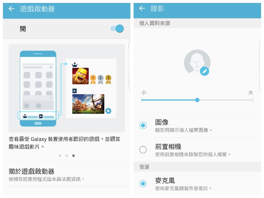 遊戲啟動器也會定期更新最受 Galaxy 裝置使用者喜愛的遊戲排名,同時可以觀賞這些遊戲的趣味影片。值得一提的是,遊戲工具中提供的錄影功能,除了能將遊戲畫面完整記錄之外,同時也能將玩家的頭像或是表情錄製在遊戲畫面中,玩家除了能決定圖像大小之外,也能決定是要以圖像還是開啟自拍鏡頭將自己的遊戲表情實況錄製進去,影片錄製完成就會有電競實況的效果。