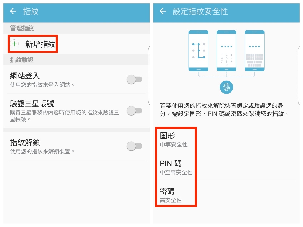 進入指紋設定選項,點擊最上方的新增指紋後,系統會先建立當指紋辨識失效時所需要的備用密碼,Galaxy S7 edge 提供了圖形、PIN 碼及一般密碼三種備用密碼,使用者可以自行選擇。值得一提的是,建立後的指紋資料可應用在網站登入、三星 APP 購物以及螢幕解鎖,讓使用者在購買三星自家 APP 時可以更加有保障。