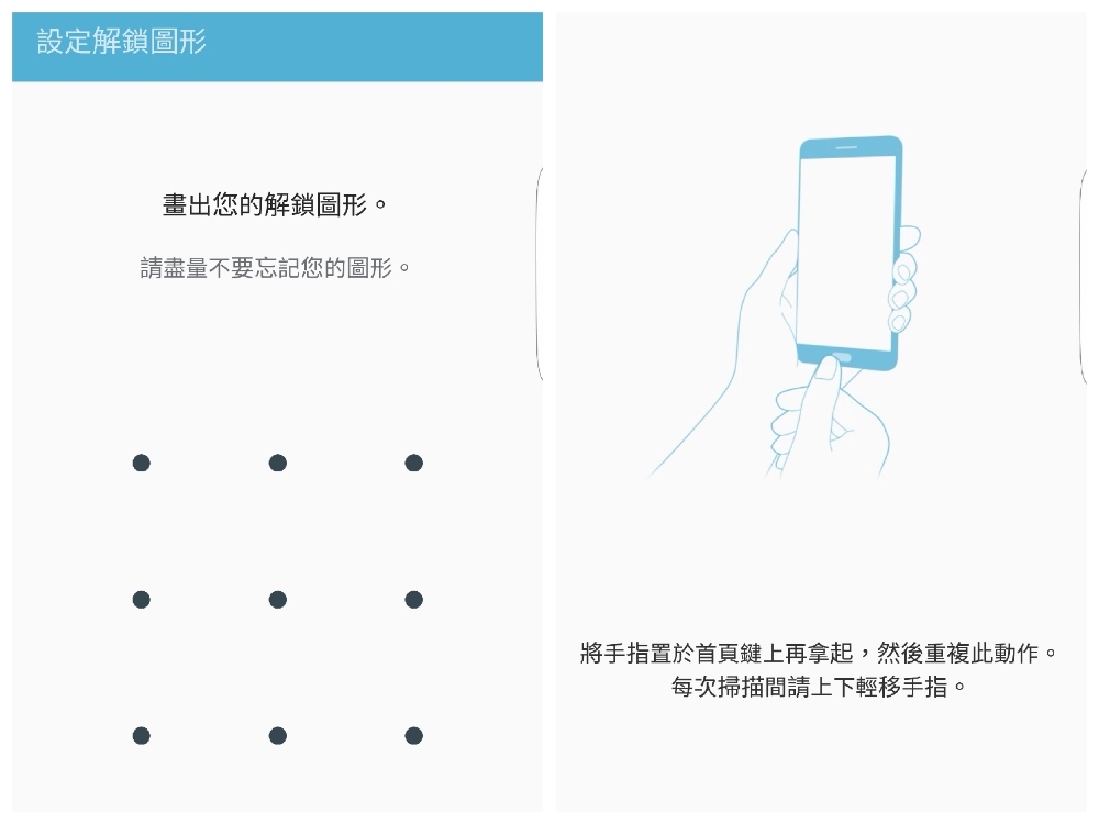 設定完備用密碼後,系統會提示使用者,以手指來回按壓 Home Key 的方式來建立指紋檔案。