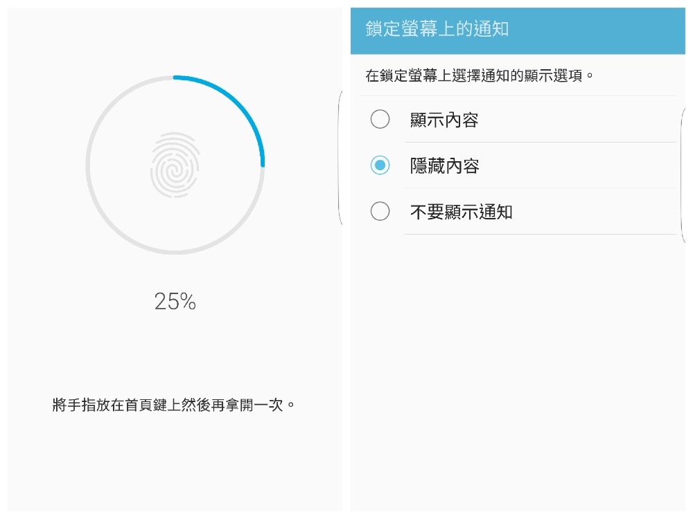 完成後系統會詢問使用者是否要隱藏所有通知內容,使用者可以依照自己的隱私習慣來做選擇。這樣就能完成指紋辨識的設定。
