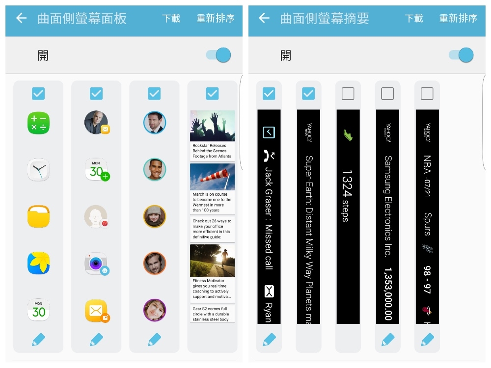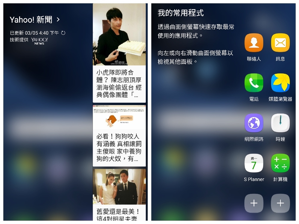 Galaxy S7 edge 不管在曲面螢幕的設計、功能皆與前一代 Galaxy S6 edge 相同,皆可以將常用的功能設定於左右兩側的雙曲面螢幕上,比較不同的是可放置在曲面螢幕上的功能變多了,比方說即時新聞瀏覽、我的常用程式、我的專屬設定、VIP 聯絡人資訊等,都可以直接呈現在曲面螢幕上。