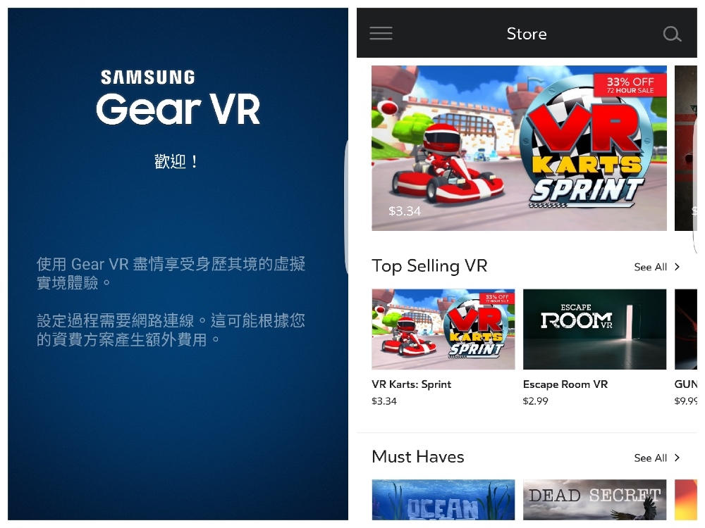 Galaxy S7 edge 為新一代年度旗艦機種,同樣也支援好玩的 Gear VR 虛擬實境,只要將 S7 edge 與 Gear VR 接上,系統就會開始下載安裝 Gear VR 所需的 APP,完成一系列的操作設定後即可享受高品質虛擬實境體驗。