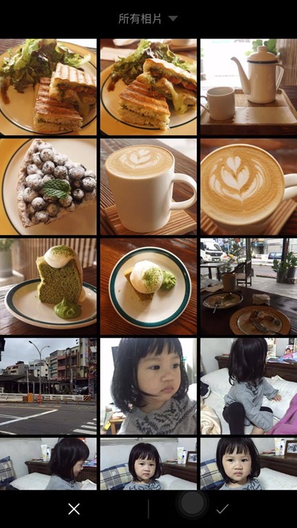 按下「+」之後就會出現你手機內照片圖庫裡的照片,可以選擇單張,或是一次選擇想要編輯的多張圖片,選好之後點選右下角的打勾圖示。