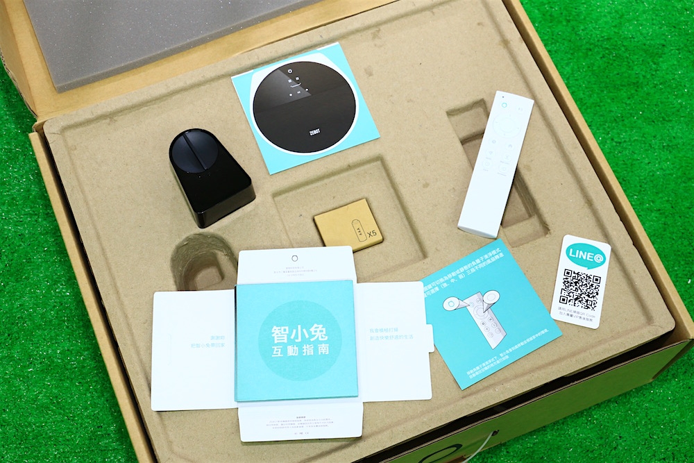 了解智小兔的特色功能後,接著將智小兔的外箱打開,首先會先看到第一層配件層,由左至右分別是區域限制的虛擬牆、簡單的外型介紹、互動指南、5 顆 4 號電池、遙控器。