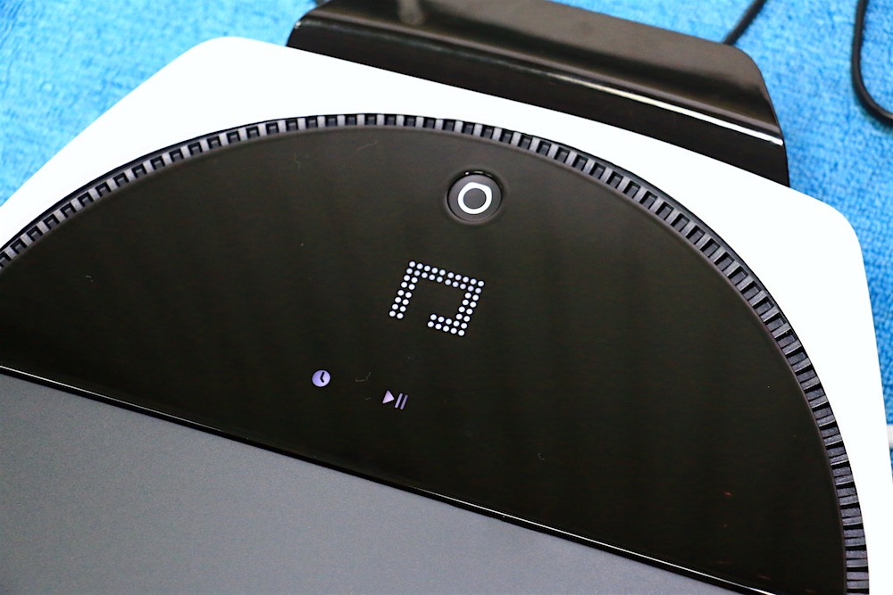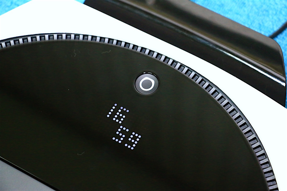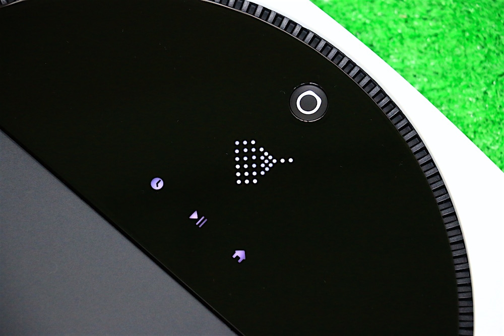 圖示小螢幕下有三個觸控點,由左至右分別是清掃時間設定、執行與暫停清掃任務及回家,在沒有遙控器的情況下也可以利用這三個觸控點來做簡單的操作。