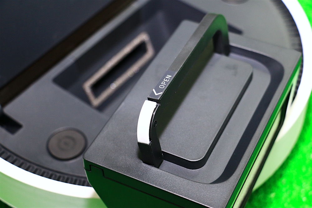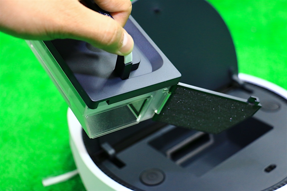 智小兔的集塵盒處處充滿巧思,除了前面提到的防止灰塵飛出的保護蓋之外,另一項巧思就是集塵盒上的這個 Open 按鈕,只要輕輕按下,就能以完全不沾手的方式將集塵盒內的灰塵倒出。