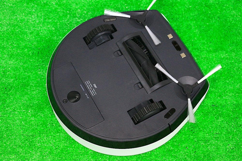 底部除了掃地用的側刷及滾輪刷之外,前面、左右兩側佈有多組感應器,主要是避免智小兔在清掃樓梯附近時發生懸空、摔落的狀況,一旦偵測到智小兔懸空,系統會立刻發出 ” 請把我放回地面 ” 的聲響,以及將掃地機器人轉向,避開摔落危機。此外,在前方感應器旁的兩個金屬接點則是智小兔的充電接點,智小兔在回家的過程中,會自動與充電座的金屬接點對齊,並準確的接上接點,進行充電。