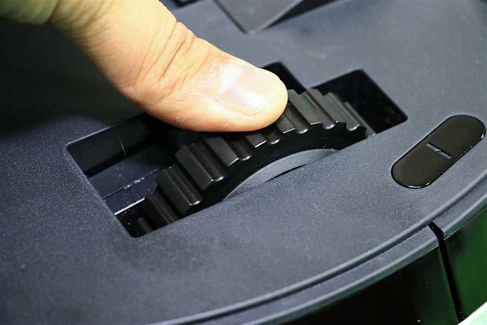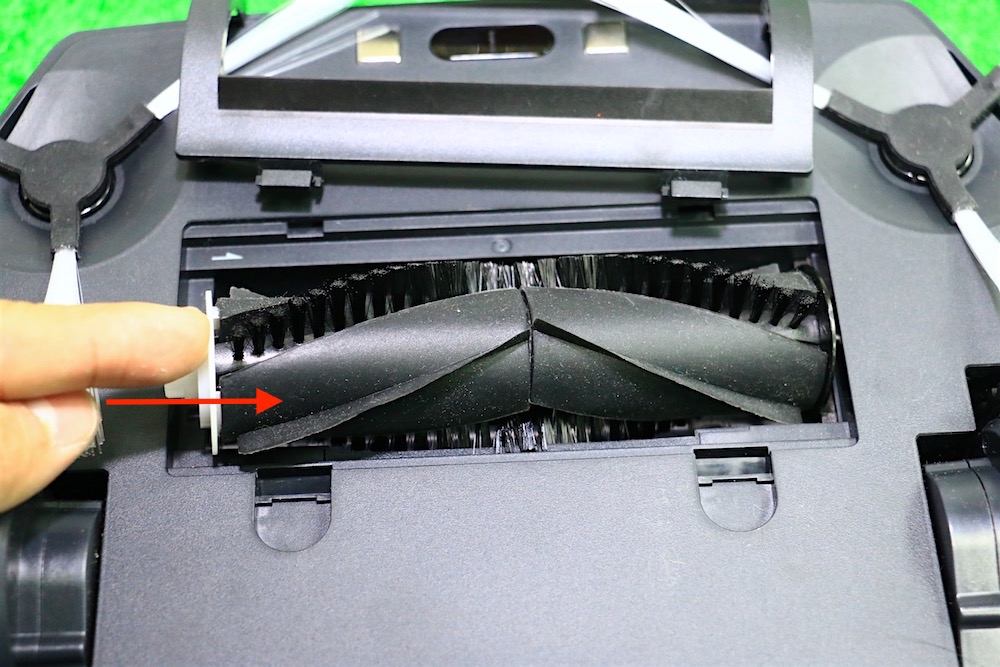 中間的滾輪刷拆卸方式相當簡單,只要將滾輪刷外的護蓋拆卸下來,接著在利用手指頂著滾輪刷左側的白色支架,往右推擠就能將滾輪刷取出。