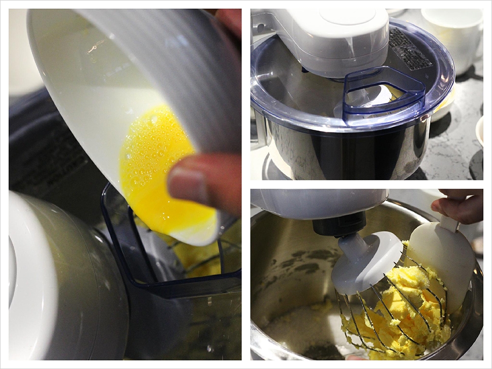 把準備好的無鹽奶油、糖、香草精倒入,攪拌成奶油色與蓬鬆狀