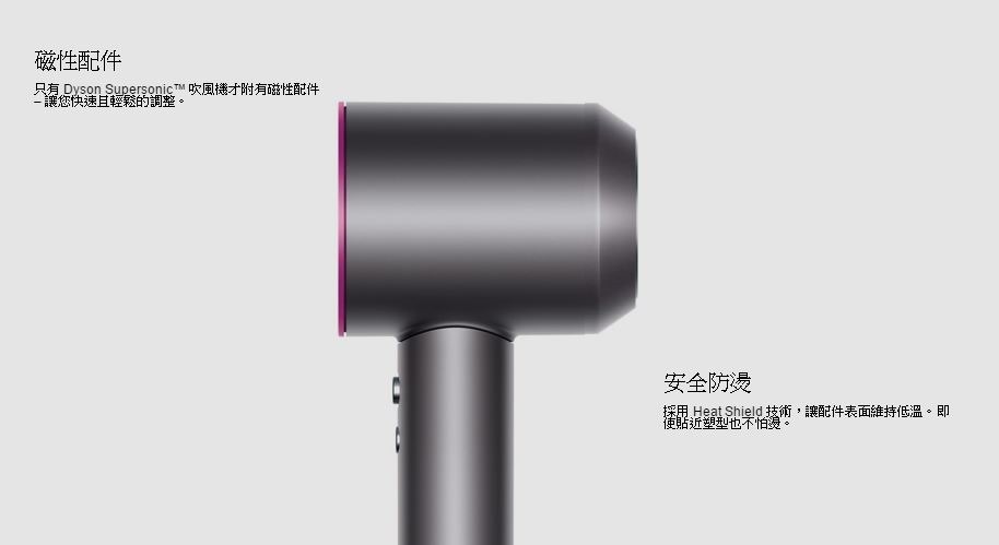 除了一般吹風機的吹乾功能之外,Dyson 利用吹嘴的設計,可以在吹乾的同時利用氣流塑型。也為了捲髮設計熱風罩,能將氣流平均分散在捲髮上面,幫助頭髮減少毛躁的困擾!而吹嘴的接頭設計為磁性連結,可以快速輕鬆的換接頭。