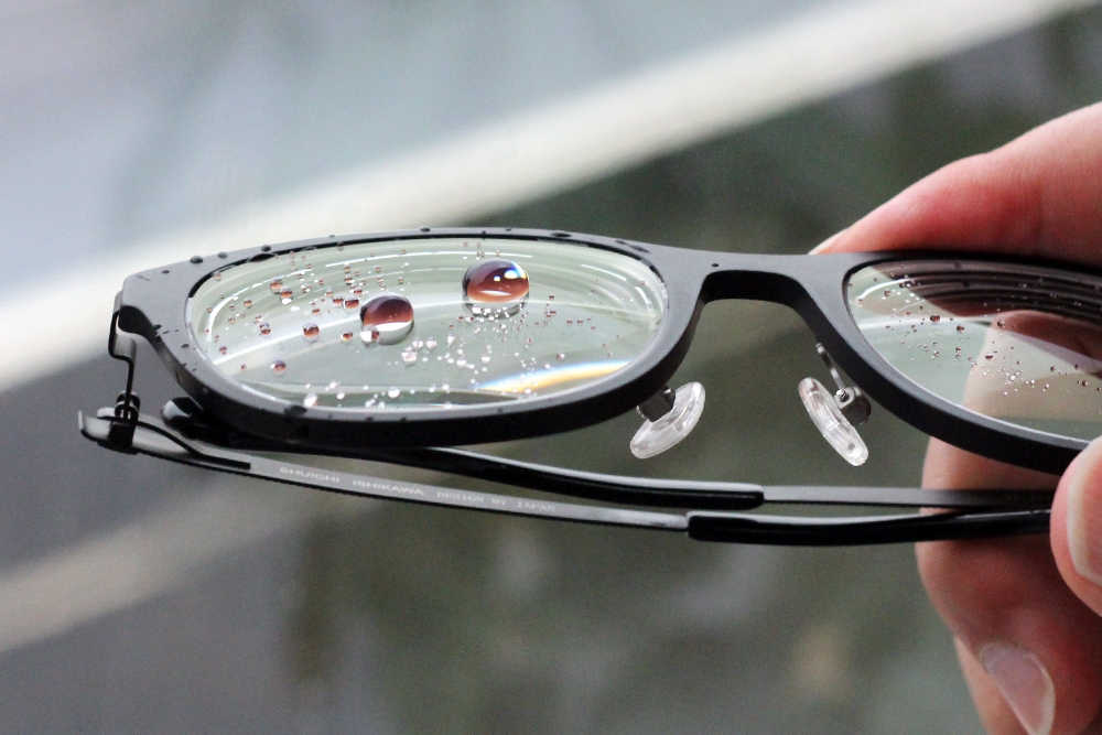 話說當時門市專業人員跟我說鏡片有奈米鍍膜,而且前後都有(太貼心),同時也會讓眼鏡不容易沾染髒污或水漬,我自己還實驗灑了些水到鏡面上,沒想到居然有疏水的特點,水都自動變成小顆的水珠,稍微吹一下或甩一下,鏡面又乾乾淨淨了,感覺好棒!