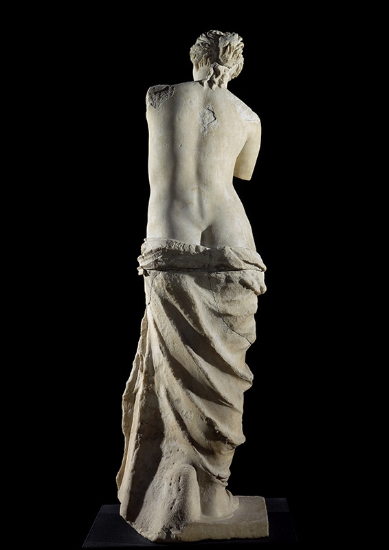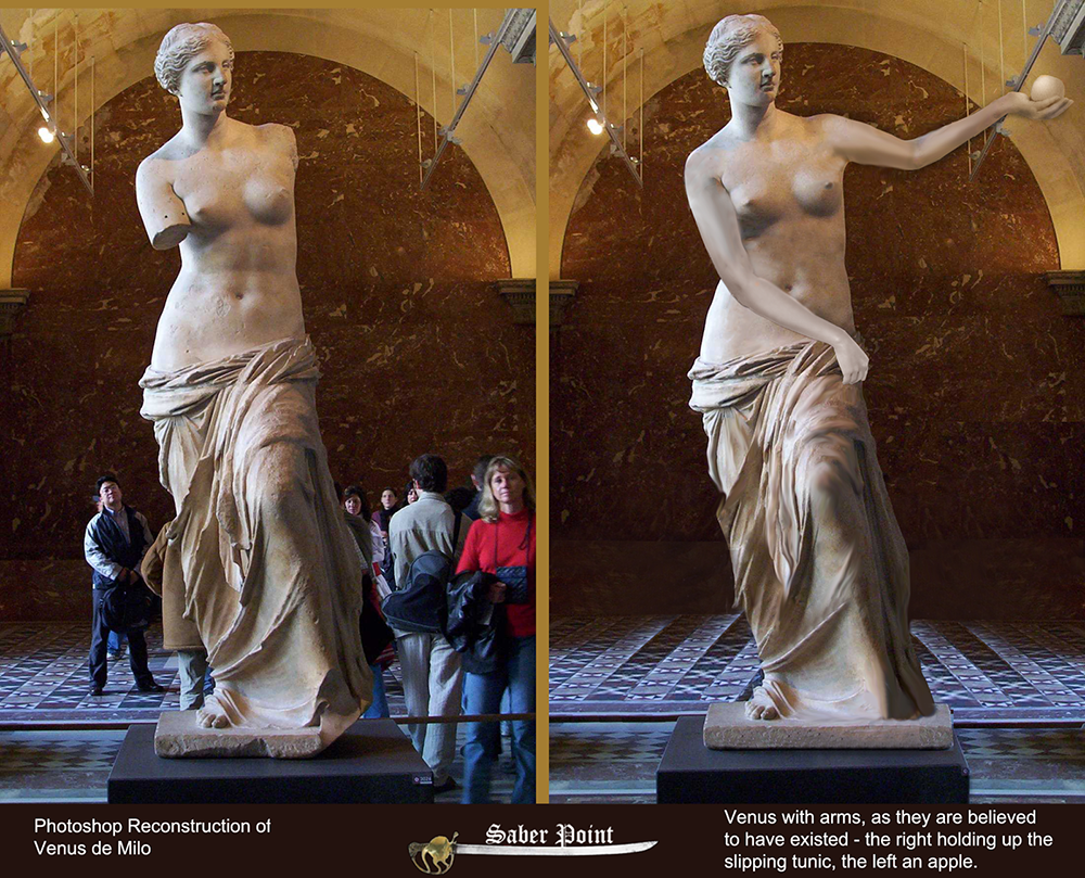 1820 年有個當地的農夫在米洛斯島上發現這尊雕像,當時的維納斯還是完整的,右臂是下垂的,手並扶著衣衿,而左臂伸過頭握著一顆蘋果,原本的模樣可能是像這樣的模擬圖。