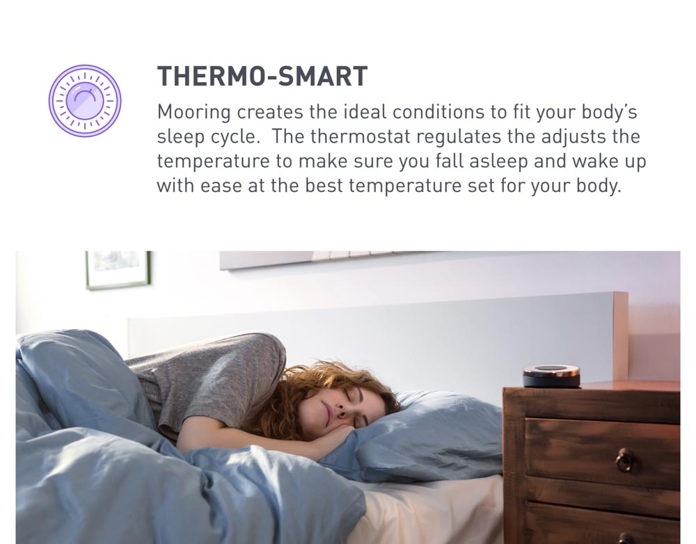 Mooring 會適應使用者身體睡眠週期的恆溫調節,確保使用者睡著和醒來對身體的溫度是舒服的。如果與人同床,提供雙重溫度監測與控制,讓不同的人有自己的睡眠模式,透過溫度的增加,Mooring 會啟動淺睡眠階段,讓使用者可以豪不費力的醒過來。