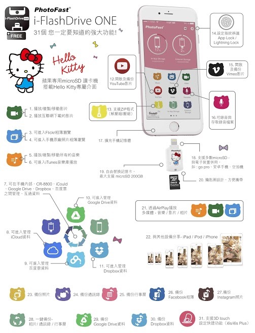PhotoFast 銀箭資訊今年1 月上市的 microSD讀卡機再度與 Hello Kitty合作,推出聯名款『PhotoFast Hello Kitty蘋果microSD讀卡機』,APP 搭配專屬Hello Kitty介面,讓可愛的Hello Kitty徹底融化妳的心,並可適用於Android/ Go Pro/行車記錄器等電子設備,達到更方便的跨裝置檔案傳輸。