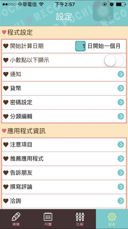 設定的功能也還蠻完善的,可以自己設定計算日期,因為不一定是從 1 號開始記帳的!另外這個 app 一開始下載好,會以日幣計算,大家要記得到設定裡面的貨幣選項修改為台幣喔!還有這個 app 可以設定密碼,避免朋友或是另一伴看手機時看到你的支出和收入!
