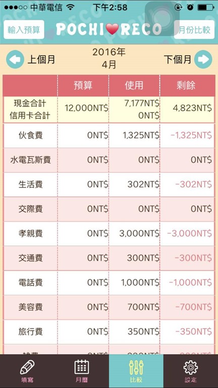 而比較的部分則是會呈現當月支出細項與金額,也能利用右上角的月份比較來看上個月和目前的消費狀況。