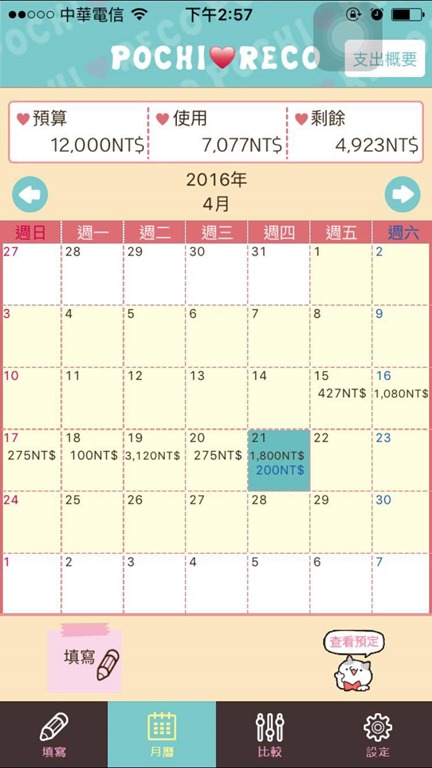 選擇月曆時,就可以看到整個月的支出金額,點進任何一天都可以檢視並做修改。