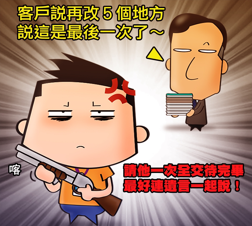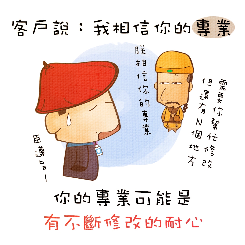 你可能常常會聽到「我相信你的專業」,但實際最後還是改到不行,Email 的某個小回覆都很可能毀了你好長一段時間的努力,如果可以,就盡量踩住你的修改底線吧!你想的「專業」和別人想的可能不一樣,因為常常不小心繞了一圈,上頭還是喜歡第一個版本的,絕對會有吐血的感覺…