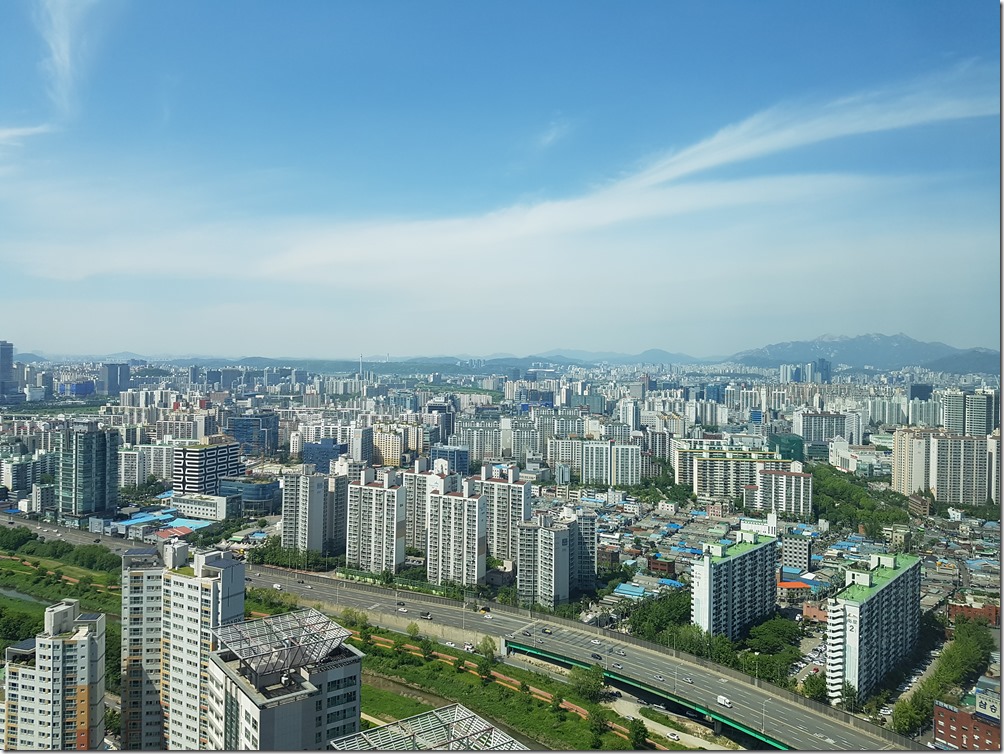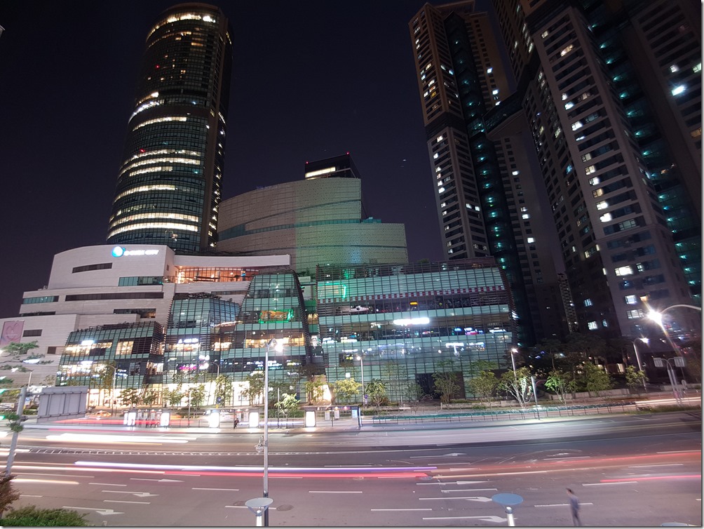 這次行程住宿部分,原本考量離逛街比較近的明洞附近,不過看到新道林站 D Cube City 中的 Sheraton 相當新穎,設備也都很棒,而且位於交通樞紐點(1號線與2號線的交接點),旁邊又是現代百貨,雖然離市中心要搭 20 分鐘左右的地鐵,但我們最後還是決定住在這。由飯店對面的街上拍整個飯店的主建築非常壯觀,飯店的樓層就是在左方高聳的建築裡。